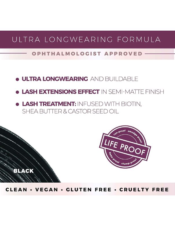 Il offre une tenue ultra-longue, une longueur spectaculaire et une définition extrême pour un effet extensions de cils. Enrichi en biotine, beurre de karité et huile de ricin, il nourrit et soigne vos cils. De minuscules « tubes » résistants à l'eau se forment autour de chaque cil et ne coulent pas, ne bavent pas, ne font pas de paquets et ne s'effritent pas, même en cas de transpiration, de larmes ou si vous vous frottez les yeux. Idéal pour les longues journées, les modes de vie actifs, les yeux sensibles ou les peaux grasses. Plus sain pour vos yeux et vos cils, il se démaquille facilement à l'eau et par simple pression (sans démaquillant).
