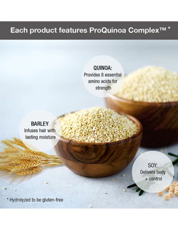 - QUINOA: A complete protein that contains eight essential amino acids to bring moisture and strength to each strand of hair.