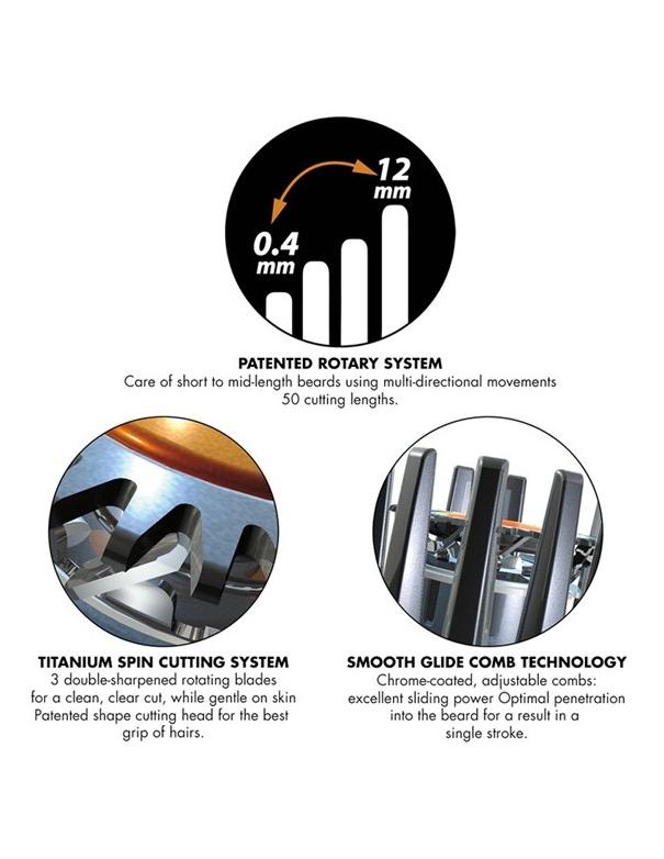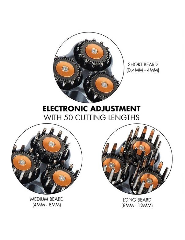 The Beard Designer is the first trimmer with 3 double-sharpened rotating blades for a clean, clear cut. The patented cutting head shape allows for the care of short to mid-length beards using multi-directional movements. With the motorized electronic adjustment feature of 50 cut lengths from 0.4 to 12 mm and increments of 0.2 mm, you can choose the length you want! The exclusive Easy Wash system and water-resistant trimmer allows for quick and easy cleaning. With the charging dock included, the Beard Designer is always ready to use. The LED display shows the current length setting and battery level, giving you total control.