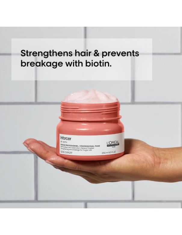 L'Oréal Professionnel Serie Expert Inforcer Masque strenghtens and reinforces fragile hair. This treatment targets breakage and split ends, leaving hair soft and healthy. With use, you will see your hair become more resistant and stronger, thanks to this formula enriched with Biotin and B6 known for their strengthening properties.