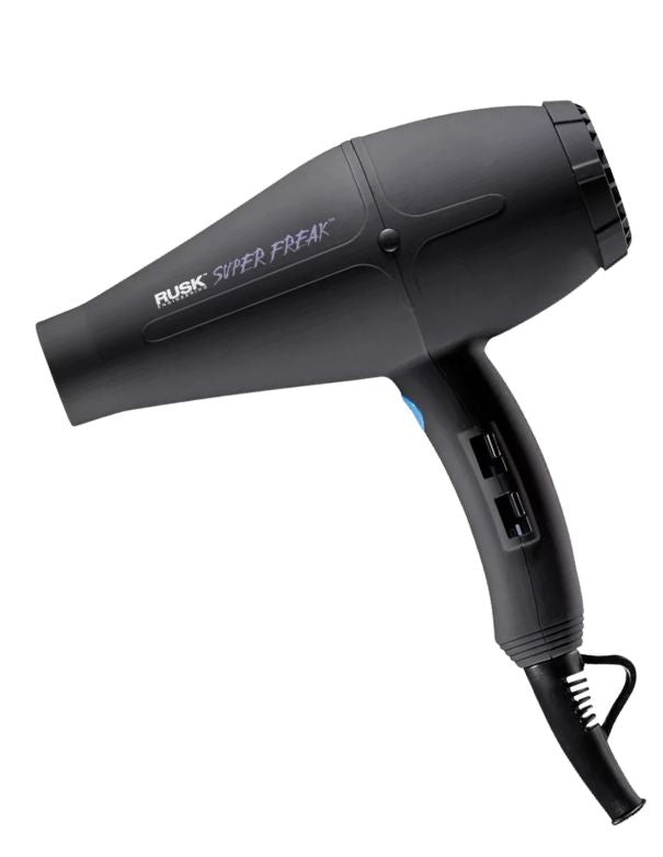 The Rusk Super Freak Professional 2000 watt dryer is built with an Italian AC motor. The Italian AC motor yields superior airfl ow and pressure. This tourmaline and ceramic dryer uses far-infrared heat and negative ions to dramatically reduce hair`s drying time. The tourmaline ceramic element emits negative ion refl ectives that enhance the vitality of the hair. The Super Freak dryer is designed for heavy-duty use by salon professionals and comes with a limited two-year warranty.